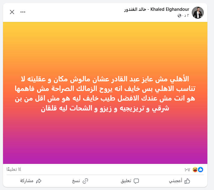 وقال الغندور في تصريحات على حسابه فيس بوك:، إن الأهلي لا يرغب في استمرار عبد القادر داخل الفريق، لأنه "مالوش مكان" في التشكيل الأساسي، إلى جانب أن عقليته "لا تناسب النادي الأهلي" من حيث الالتزام والانضباط.