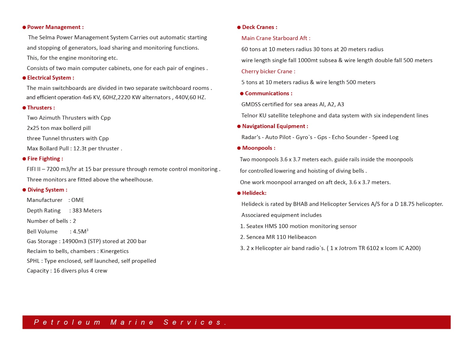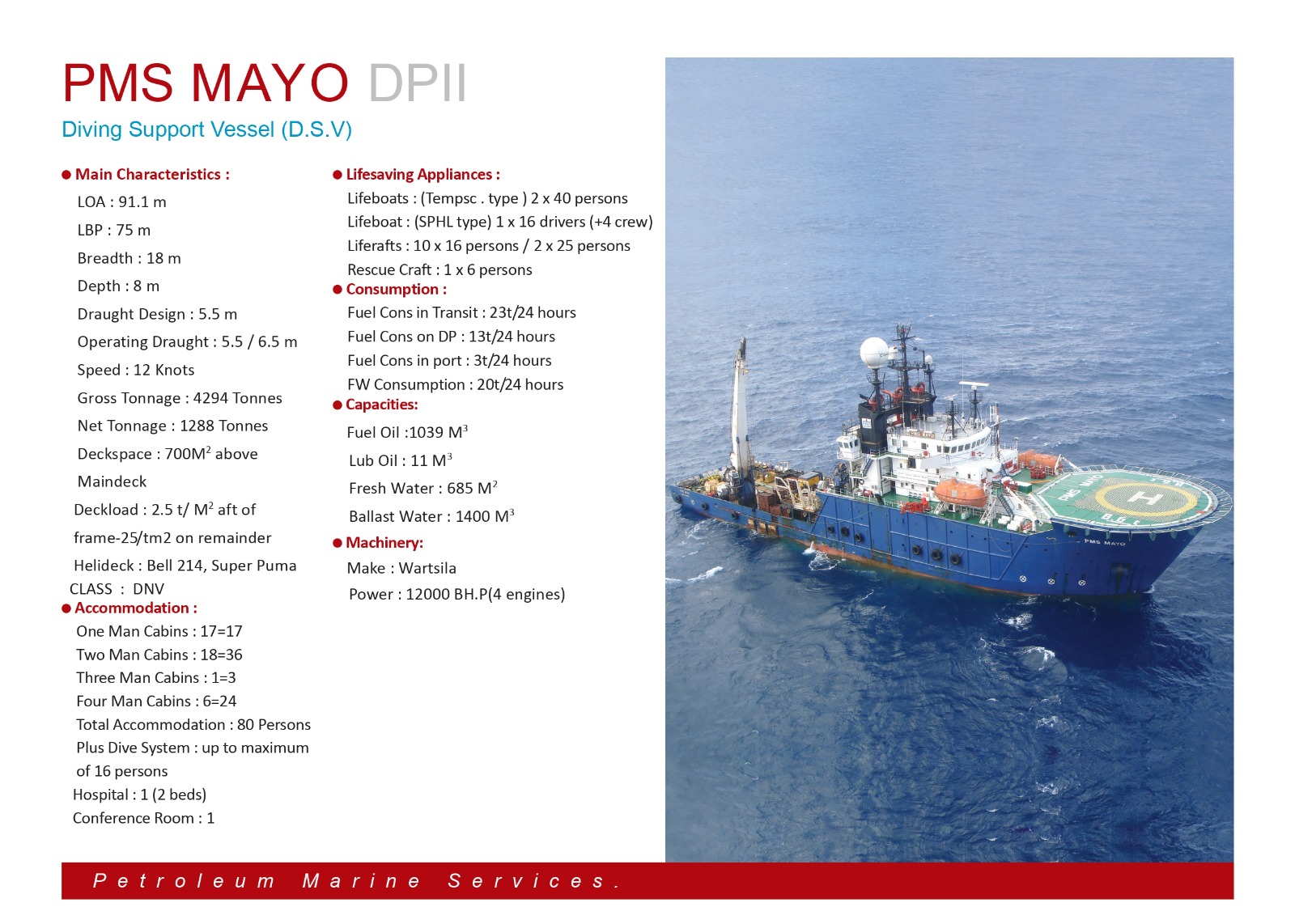 السفينة الجديدة PMS-MAYO ، هى الوحيدة فى مصر المجهزة بوحدة غطس بالإضافة لوحدة آلية للتحكم عن بعد (ROV) ، فضلا عن أنها تتضمن ونش بحمولة 60 طن.