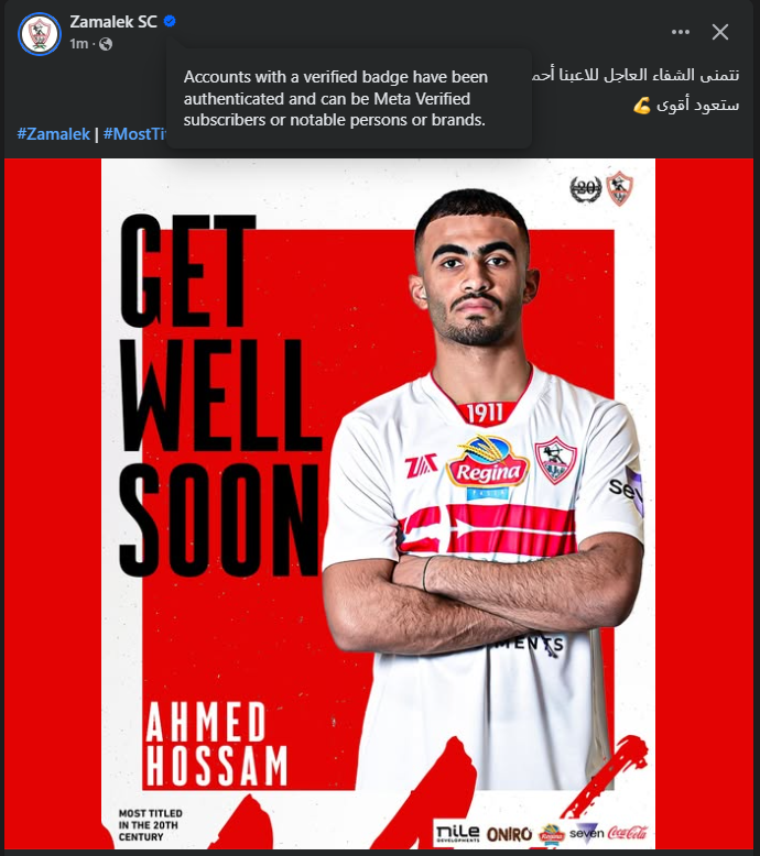 حرص الحساب الرسمي لنادي الزمالك، على دعم ومساندة أحمد حسام لاعب الفريق الأول لكرة القدم، وذلك بعد تعرضه لإصابه بقطع فى الرباط الصليبي.