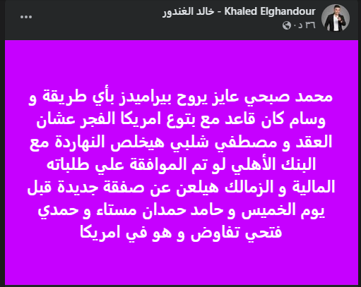 وكتب خالد الغندور في تصريحاته على فيس بوك، محمد صبحي عايز يروح بيراميدز بأي طريقة ووسام كان قاعد مع بتوع أمريكا الفجر عشان العقد ومصطفي شلبي هيخلص النهاردة مع البنك الأهلي لو تم الموافقة علي طلباته المالية.
