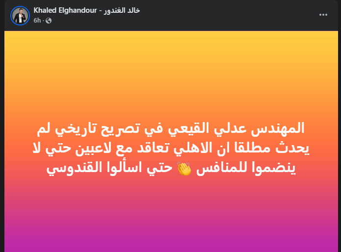 وكتب خالد الغندور عبر حسابه الرسمي" فيس بوك": المهندس عدلي القيعي في تصريح تاريخي لم يحدث مطلقا أن الاهلي تعاقد مع لاعبين حتي لا ينضموا للمنافس حتي اسألوا القندوسي".