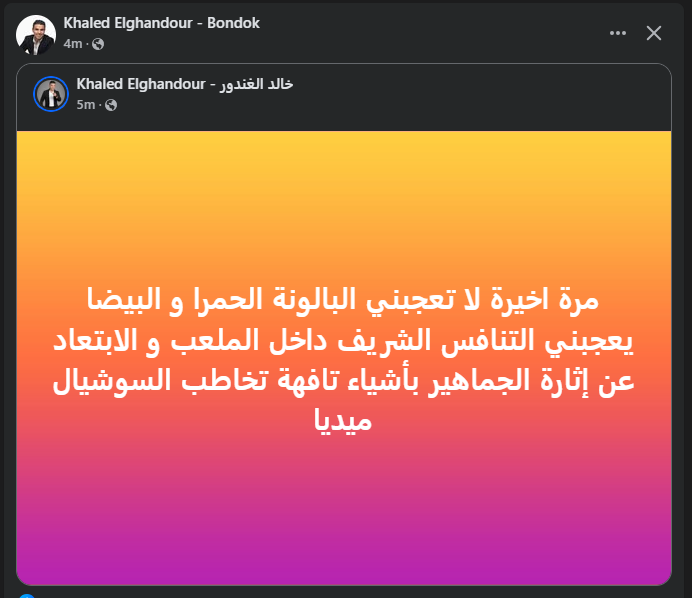 تحيا مصر، وكتب خالد الغندور عبر حسابه الرسمي" فيس بوك": مرة اخيرة لا تعجبني البالونة الحمرا و البيضا يعجبني التنافس الشريف داخل الملعب و الابتعاد عن إثارة الجماهير بأشياء تافهة تخاطب السوشيال ميديا".