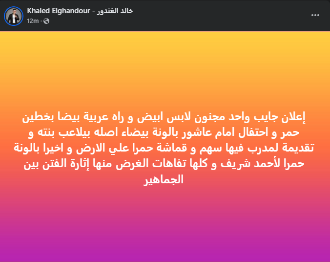 وتابع قائلاً:" إعلان جايب واحد مجنون لابس ابيض و راه عربية بيضه بخطين حمر، و احتفال امام عاشور بالونة بيضاء اصله بيلاعب بنته، و تقديمة لمدرب فيها سهم و قماشة حمرا علي الارض و اخيرا بالونة حمرا لأحمد شريف و كلها تفاهات الغرض منها إثارة الفتن بين الجماهير".