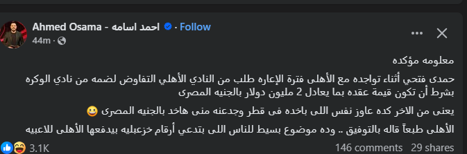 تحيا مصر، وكتب إعلامي قناة النادي الأهلي أحمد أسامة عبر حسابه الرسمي" فيس بوك": معلومه مؤكده، حمدى فتحي أثناء تواجده مع الأهلى فترة الإعاره طلب من النادي الأهلي التفاوض لضمه من نادي الوكره بشرط أن تكون قيمة عقده بما يعادل 2 مليون دولار بالجنيه المصرى".