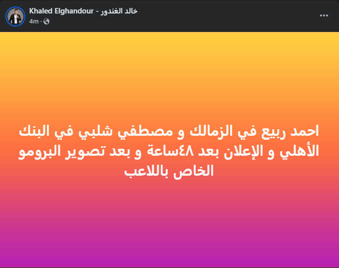 تحيا مصر، وكتب خالد الغندور عبر حسابه الرسمي:" فيس بوك": احمد ربيع في الزمالك و مصطفي شلبي في البنك الأهلي و الإعلان بعد ٤٨ساعة و بعد تصوير البرومو الخاص باللاعب".
