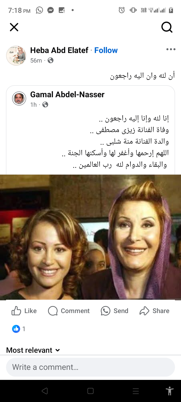 وكتب الفنان جمال عبد الناصر في منشور رصده موقع تحيا مصر عبر حسابه الرسمي بموقع التواصل الاجتماعي فيسبوك: إنا لله وإنا إليه راجعون .. وفاة الفنانة زيزى مصطفى .. والدة الفنانة منة شلبى .. اللهم إرحمها وأغفر لها وأسكنها الجنة .. والبقاء والدوام لله رب العالمين.