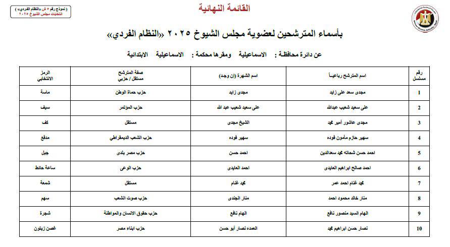 وتتضمن القائمة اسماء المرشحين على المقعد الفردي بمحافظة الإسماعيلية وعددهم 12 وهم كلا من: