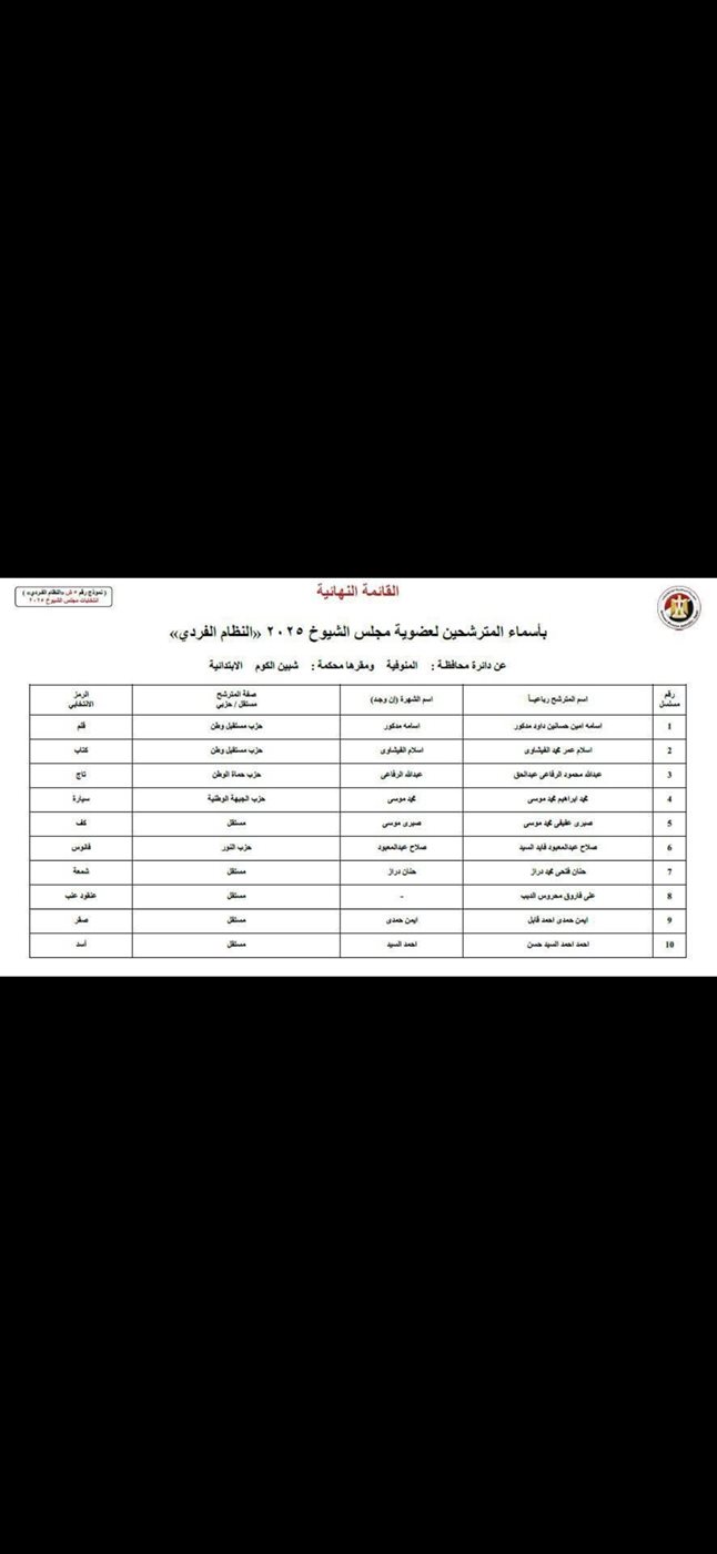 أعلنت الهيئة الوطنية للانتخابات القائمة النهائية للمرشحين على المقاعد الفردية لمجلس الشيوخ بمحافظة المنوفية، وذلك عقب انتهاء كافة الإجراءات القانونية، وانقضاء فترة فحص الأوراق والطعون وفقًا للجدول الزمني المحدد.