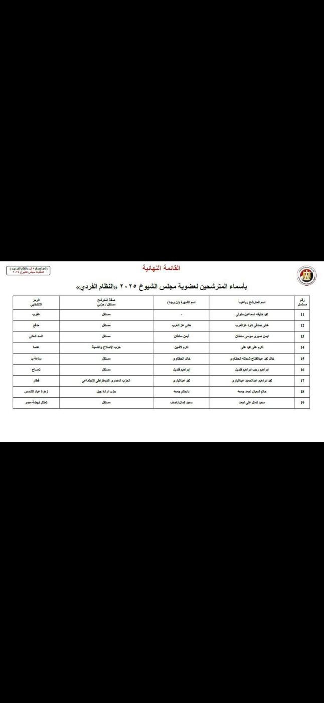 وتقدم 19 مرشحً على النظام الفردى لخوض الانتخابات لعضوية مجلس الشيوخ 2025.