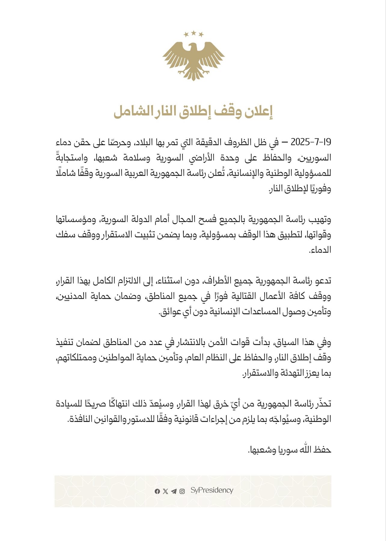 ثمّن الشرع المواقف البطولية للعشائر السورية، وخاصة في الجنوب، داعيًا إلى الوقف الفوري لإطلاق النار، والتوحد خلف الدولة في هذا الظرف الحساس.