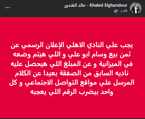 وكتب خالد الغندور على فيس بوك، يجب علي النادي الاهلي الإعلان الرسمي عن ثمن بيع وسام أبو علي واللي هيتم وضعه في الميزانية وعن المبلغ اللي هيحصل عليه ناديه السابق من الصفقة.