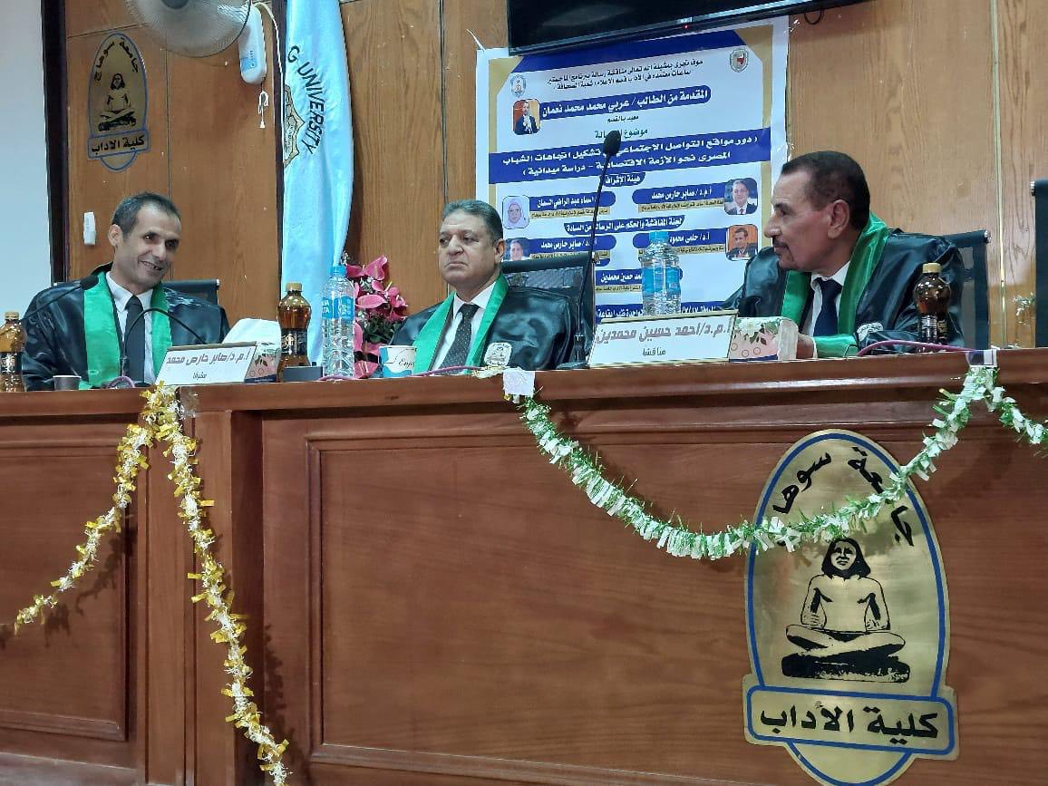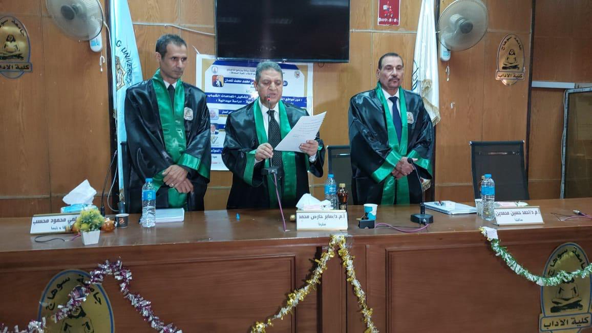 وقال الدكتور محمد توفيق، عميد الكلية الآداب، أن لجنة الإشراف على الرسالة ضمت كلا من الدكتور صابر حارص محمد، أستاذ الصحافة المساعد المتفرغ بقسم الإعلام، والدكتورة أسماء عبد الراضي السمان، مدرس الصحافة بالقسم، أما لجنة المناقشة والحكم فقد شملت كلا من الدكتور حلمي محمود محسب، رئيس قسم الإعلام الإلكتروني بكلية الإعلام وتكنولوجيا الاتصال بجامعة قنا (رئيسًا ومناقشًا)، والدكتور صابر حارص، والدكتور أحمد حسين محمدين، أستاذ الصحافة المساعد المتفرغ بكلية الآداب بسوهاج.
