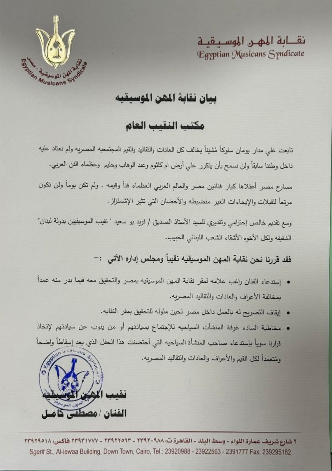 راغب علامة يلبي قرار مصطفى كامل ويعلق: مصر بلدى الثانية ونقابة الموسيقيين بيتي