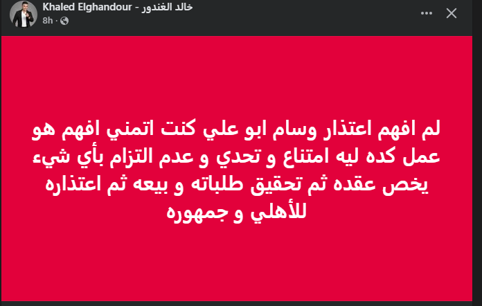 تحيا مصر، وكتب خالد الغندور عبر حسابه الرسمي"فيس بوك":" لم افهم اعتذار وسام ابو علي كنت اتمني افهم هو عمل كده ليه امتناع و تحدي، و عدم التزام بأي شيء يخص عقده ثم تحقيق طلباته و بيعه ثم اعتذاره للأهلي و جمهوره".