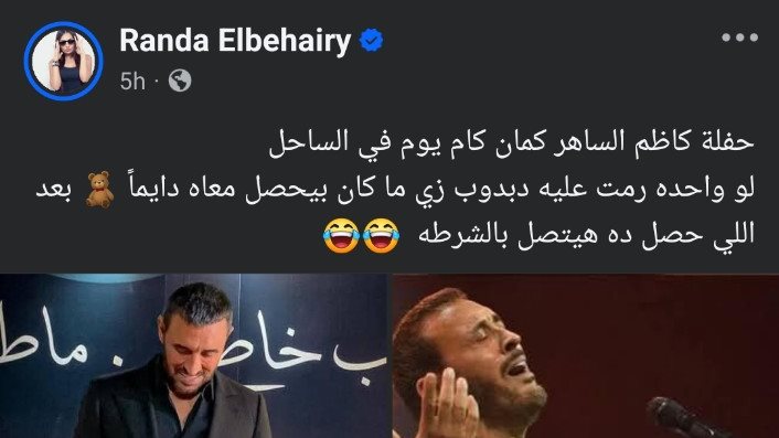 ونشرت راندا البحيري منشور عبر حسابها على فيسبوك ممازحة الجمهور وقالت وفقًا لما رصده موقع تحيا مصر: “حفلة كاظم الساهر كمان كام يوم في الساحل لو واحده رمت عليه دبدوب زي ما كان بيحصل معاه دايماً بعد اللي حصل ده هيتصل بالشرطة”، وانهالت التعليقات من متابعيها الذين مازحوها.