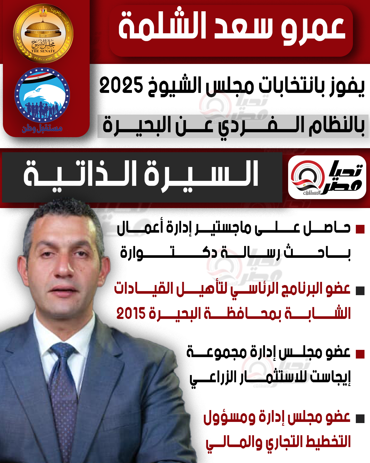 تحيا مصر ينشر السيرة الذاتية للنائب عمرو سعد الشلمة عضو مجلس الشيوخ 2025 فردي بالبحيرة