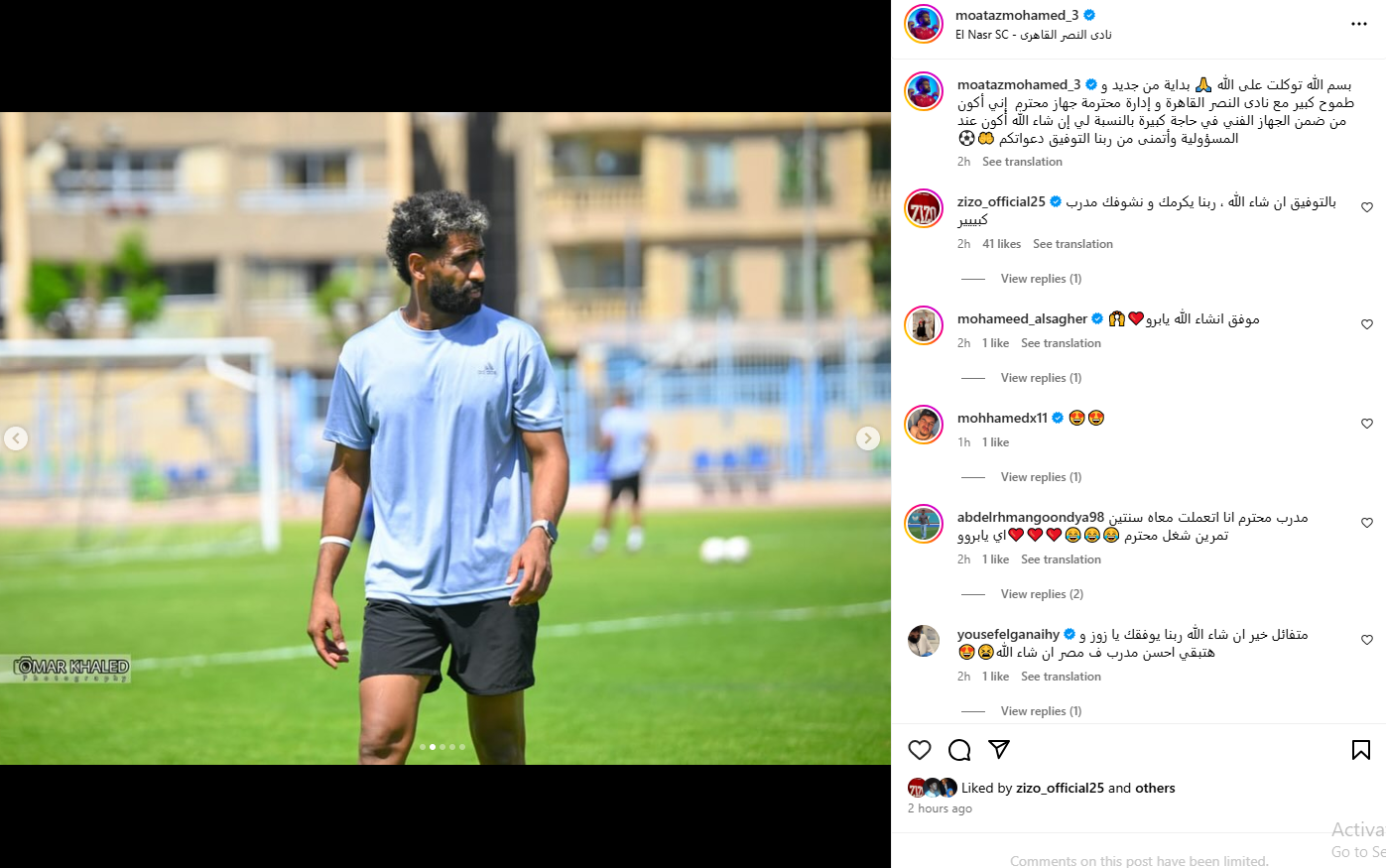 تحيا مصر، وكتب معتز نجيب عبر حسابه الرسمي" انستجرام": بسم الله توكلت على الله بداية من جديد، و طموح كبير مع نادى النصر القاهرة، و إدارة محترمة جهاز محترم إني أكون من ضمن الجهاز الفني في حاجة كبيرة بالنسبة لي إن شاء الله أكون عند المسؤولية وأتمنى من ربنا التوفيق دعواتكم".