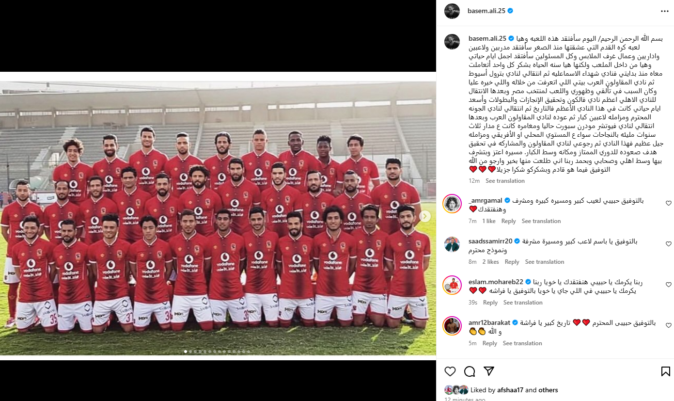 تحيا مصر، وكتب باسم على عبر حسابه الرسمي" إنستجرام": بسم الله الرحمن الرحيم/ اليوم سأفتقد هذه اللعبه، وهي لعبة كره القدم التي عشقتها منذ الصغر سأفتقد مدربين ولاعبين وإداريين، وعمال غرف الملابس، وكل المسئولين سأفتقد أجمل أيام حياتي، وهي من داخل الملعب، ولكنها هيا سنة الحياة".