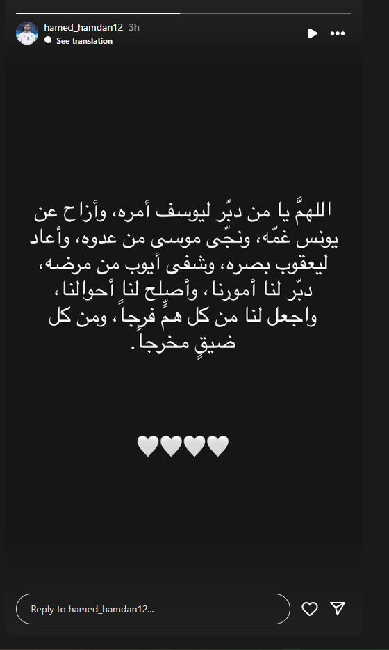 تحيا مصر، وكتب حامد حمدان عبر حسابه الرسمي" إنستجرام":" اللهم يا من دبر ليوسف أمره ، وأزح عن يوسف غمع، ونجي موسي من عدوه، وأعاد ليعقوب بصره، وشفي أيوب من مرضه، دبر لنا أمورنا، وأصلح لنا أحوالنا، وأجعل لنا من كل هم فرحاً، ومن كل ضيق مخرجاً".