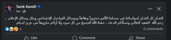 تحيا مصر، وكتب طارق القنديل عضو مجلس إدارة النادي الأهلي عبر حسابه الرسمي"فيس بوك":" الشكر كل الشكر لمواساتنا في مصابنا الأليم حضوراً، وهاتفاً وبوسائل التواصل الإجتماعي وبكل وسائل الإعلام".