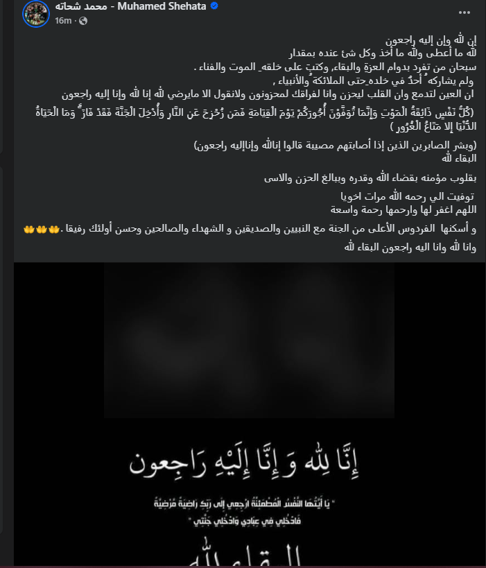 تحيا مصر، وكتب محمد شحاتة لاعب الزمالك عبر حسابه الرسمي" فيس بوك": إن لله وإن إليه راجعون، لله ما أعطى ولله ما أخذ وكل شئ عنده بمقدار سبحان من تفرد بدوام العزةِ والبقاء, وكتبَ على خلقه ِ الموت والفناء ، ولم يشاركه ُ أحدٌ في خلده ِحتى الملائكة ُوالأنبياء، ان العين لتدمع وان القلب ليحزن وانا لفراقك لمحزونون ولانقول الا مايرضي لله إنا لله وإنا إليه راجعون (كُلُّ نَفْسٍ ذَائِقَةُ الْمَوْتِ وَإِنَّمَا تُوَفَّوْنَ أُجُورَكُمْ يَوْمَ الْقِيَامَةِ فَمَن زُحْزِحَ عَنِ النَّارِ وَأُدْخِلَ الْجَنَّةَ فَقَدْ فَازَ ۗ وَمَا الْحَيَاةُ الدُّنْيَا إِلا مَتَاعُ الْغُرُورِ )، (وبشر الصابرين الذين إذا أصابتهم مصيبة قالوا إنالله وإناإلیه راجعون)، البقاء لله، بقلوب مؤمنه بقضاء الله وقدره وببالغ الحزن والاسى، توفيت الي رحمه الله مرات اخويا".