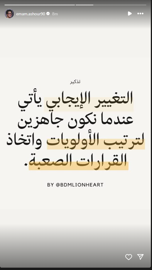 تحيا مصر، وكتب إمام عاشور لاعب الأهلي عبر حسابه الرسمي" فيس بوك": التغيير الإيجابي يأتي عندما نكون جاهزين لترتيب الأولويات واتخاذ القرارات الصعبة".