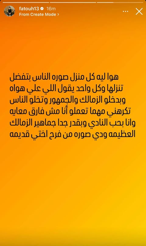 قال أحمد فتوح لاعب نادي الزمالك، بأنه يتعرض للظلم في الفترة الحالية، ويتم نشر صور قديمة له من إحدى الحفلات لحدوث أزمة مع النادي وجماهيره، وكتب أحمد فتوح في رسالته عبر ستوري إنستجرام، هو ليه كل منزل صور الناس تفضل تنزلها وكل واحد يقول اللي على هواه ويدخلوا الزمالك والجمهور، وتخلو الناس تكرهني، وزاد أحمد فتوح، مهما تعملوا أنا مش فارق معايا وأنا بحب النادي وبقدر جدا جماهير الزمالك العظيمة ودي صورة من فرح أختي قديمة.