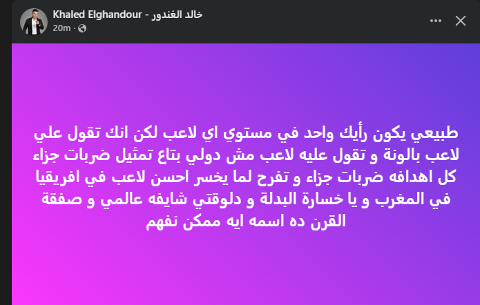 تحيا مصر، وكتب خالد الغندور عبر حسابه الرسمي" فيس بوك": طبيعي يكون رأيك واحد في مستوي أي لاعب لكن انك تقول علي لاعب بالونة، وتقول عليه لاعب مش دولي بتاع تمثيل ضربات جزاء كل اهدافه ضربات جزاء".