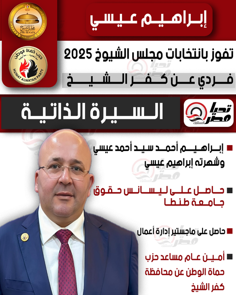 تحيا مصر ينشر السيرة الذاتية للنائب إبراهيم عيسي عضو مجلس الشيوخ 2025 “فردي كفر الشيخ”