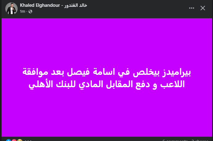 تحيا مصر، وكتب خالد الغندور عبر حسابه الرسمي"فيس بوك": بيراميدز بيخلص في اسامة فيصل بعد موافقة اللاعب و دفع المقابل المادي للبنك الأهلي".