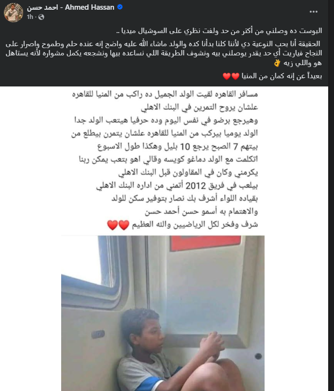 تحيا مصر، وكتب أحمد حسن عبر حسابه الرسمي" فيس بوك": البوست ده وصلني من أكتر من حد ولفت نظري على السوشيال ميديا".