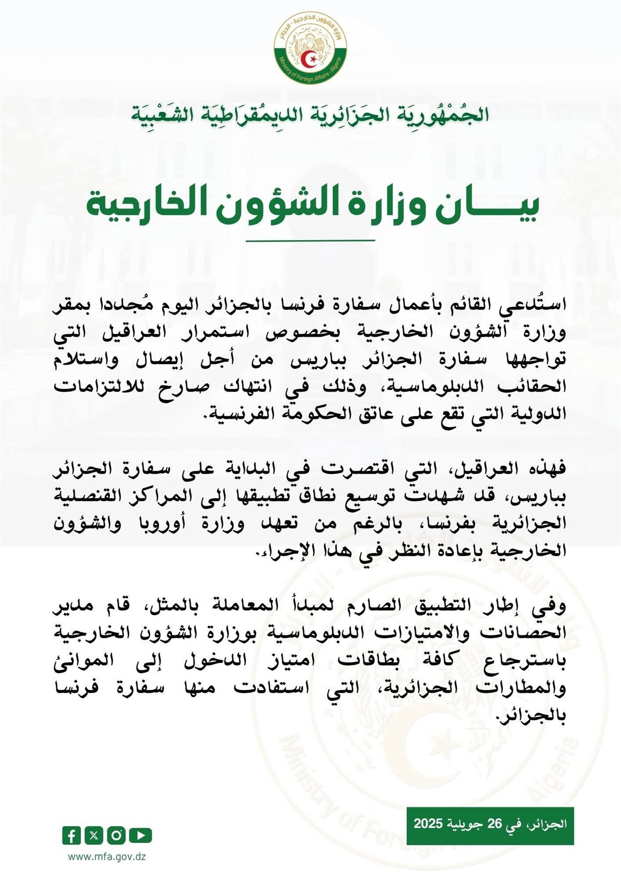 بيان الخارجية أشار إلى أن العراقيل التي كانت في البداية مقتصرة على سفارة الجزائر بباريس، امتدت لاحقًا لتشمل المراكز القنصلية الجزائرية في فرنسا، ما زاد من حدة الأزمة الدبلوماسية بين البلدين.