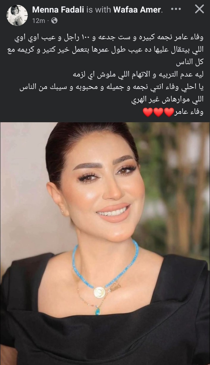 حرصت الفنانة منة فضالي على الدفاع عن الفنانة وفاء عامر ودعمها أمام الشائعات التي طالتها، حيث كانت تعرضت الفنانة الكبيرة وفاء عامر مؤخراً لهجوم واسع عبر منصات التواصل الاجتماعي، تمثل في حملة تشويه مغرضة تتضمن اتهامات لا أساس لها من الصحة، ما أثار موجة تضامن كبيرة من قبل عدد من الفنانين والنقابات الفنية.