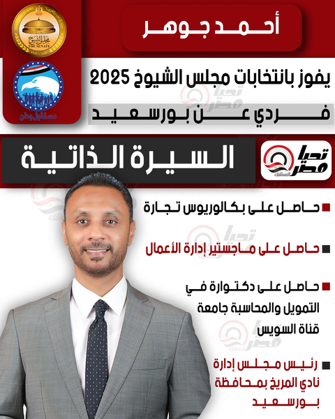 تحيا مصر ينشر السيرة الذاتية للنائب أحمد جوهر عضو مجلس الشيوخ 2025 بالنظام الفردي عن محافظة بور سعيد