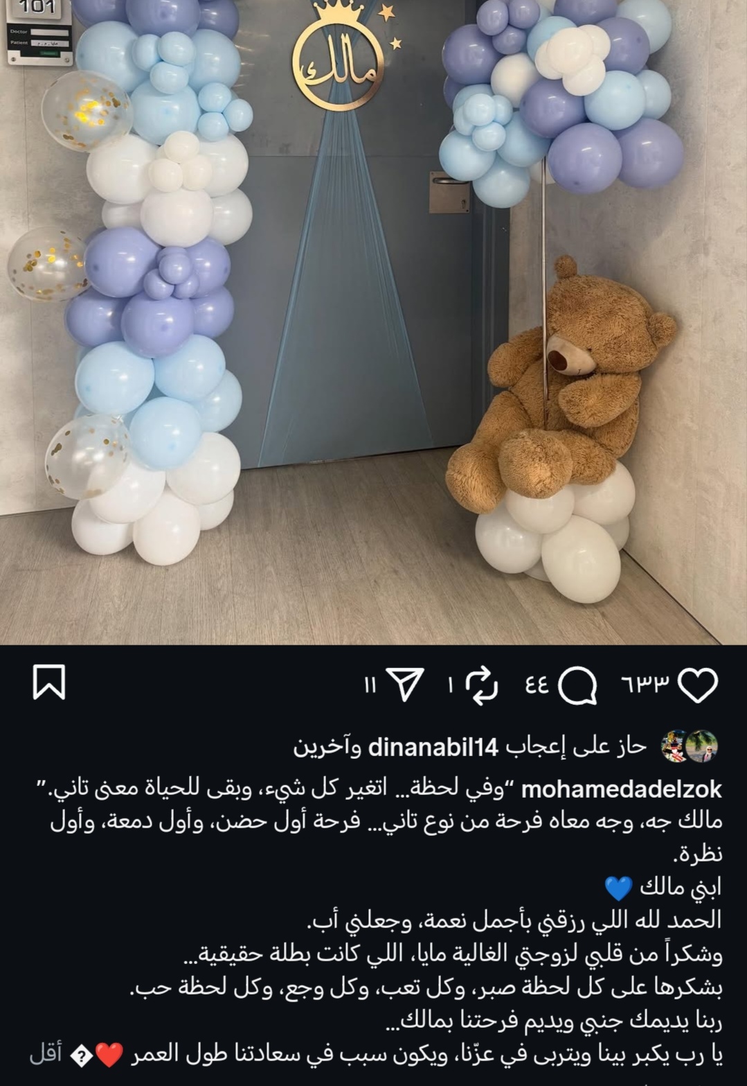 وكتب محمد عادل:"وفي لحظة... اتغير كل شيء، وبقى للحياة معنى تاني مالك جه، وجه معاه فرحة من نوع تاني... فرحة أول حضن، وأول دمعة، وأول نظرة.