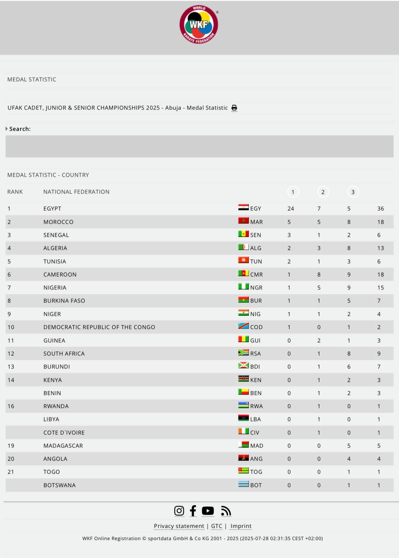 وتمكنت مصر من فرض هيمنتها على منافسات البطولة، متصدرة جدول الميداليات بإجمالي 36 ميدالية متنوعة، بواقع 24 ذهبية، و7 فضيات، و5 برونزيات، متقدمة بفارق كبير على المغرب التي حلت في المركز الثاني بـ18 ميدالية، تليها السنغال في المركز الثالث بـ6 ميداليات.
