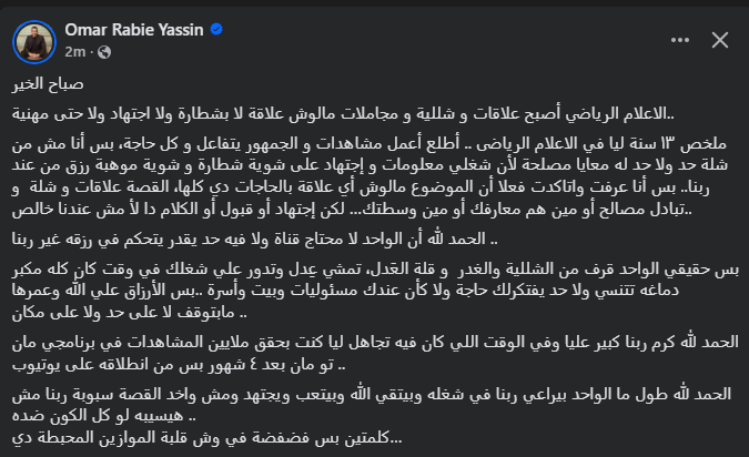تحيا مصر، وكتب عمر ربيع ياسين عبر حسابه الرسمي" فيس بوك": الاعلام الرياضي أصبح علاقات و شللية و مجاملات مالوش علاقة لا بشطارة ولا اجتهاد ولا حتى مهنية".