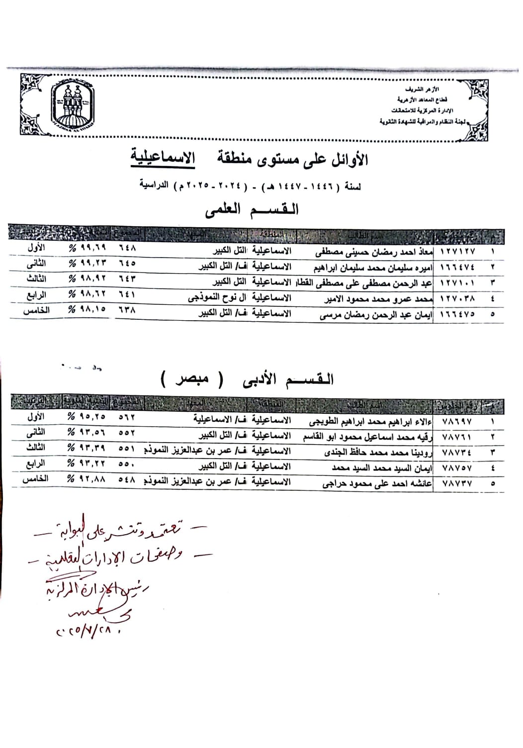 وجاءت قائمة أوائل الشهادة الثانوية الأزهرية على مستوى محافظة الإسماعيلية على النحو التالي: