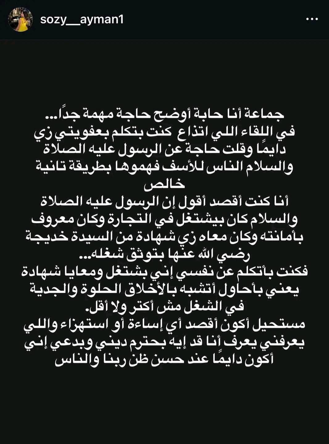 وقالت البلوجر سوزي الأردنية في منشور عبر حسابها الرسمي على موقع تبادل الصور والفيديوهات انستجرام عن اتهامها بالإذاءة للرسول مؤكدة أنها لن تتعمد ذلك بل كانت تتحدث بعفوية، وقالت: "جماعة أنا حابة أوضح حاجة مهمة جدا.. في اللقاء اللي اتذاع كنت بتكلم بعفويتي زي دايما وقلت حاجة عن الرسول عليه الصلاة والسلام الناس للأسف فهموها بطريقة تانية خالص، أنا كنت أقصد أقول إن الرسول عليه الصلاة والسلام كان بيشتغل في التجارة وكان معروف بأمانته وكان معاه زي شهادة من السيدة خديجة رضي الله عنها بتوثق شغله، فكنت بأتكلم عن نفسي إني بشتغل ومعايا شهادة يعني بأحاول أتشبه بالأخلاق الحلوة والجدية في الشغل مش أكثر ولا أقل."