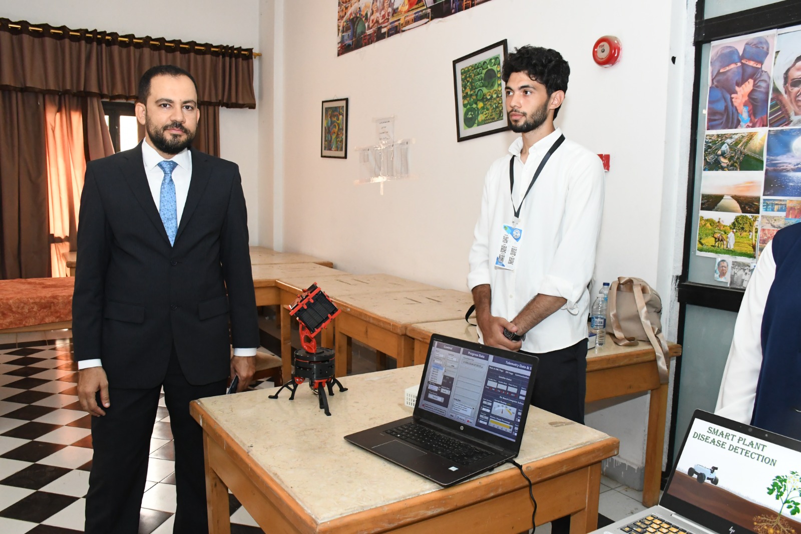 الزراعة الذكية: الطالبتان آلاء سمير إبراهيم (قسم الميكاترونكس) وسلمى صالح قريش (قسم الاتصالات) ابتكرتا نظاماً ذكياً يعتمد على الطائرات بدون طيار والروبوتات المزودة بكاميرات للكشف المبكر عن أمراض النباتات، بالاعتماد على الذكاء الاصطناعي وتحليل الصور، مع إمكانية التحكم عبر تطبيق ذكي.