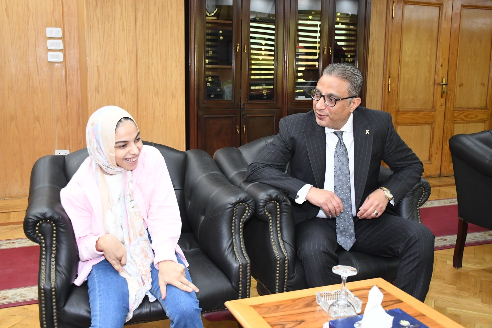 في لفتة إنسانية ممزوجة بعطف الأبوة، استجاب الدكتور أحمد الأنصاري محافظ الفيوم، لرغبة الطالبة "مي محمود طاهر لطيف"، إحدى الطالبات المتفوقات بشهادة الثانوية العامة، من ذوي الهمم، والتي أبدت رغبتها في لقاء السيد المحافظ، عبر فيديو موقع تحيا مصر.