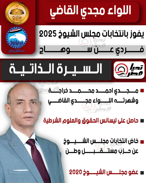 فاز النائب واللواء مجدي القاضي، مرشح حزب مستقبل وطن بانتخابات مجلس الشيوخ 2025 بالنظام الفردي عن محافظة سوهاج.