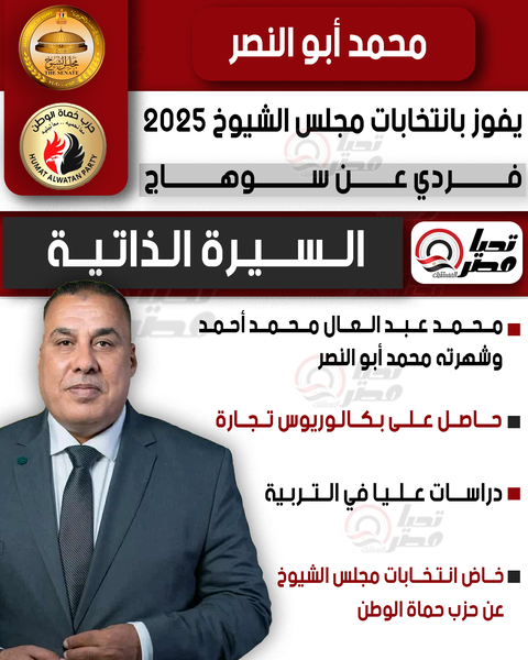 وخلال السطور التالية ينشلر لكم" تحيا مصر" السيرة الذاتية للنائب محمد أبو النصر عضو مجلس الشيوخ 2025 بالنظام الفردي عن سوهاج، كما يلي: