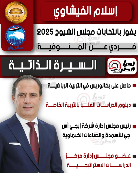 تحيا مصر ينشر السيرة الذاتية للنائب إسلام الفيشاوي عضو مجلس الشيوخ 2025 بالنظام الفردي عن المنوفية