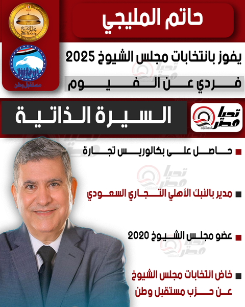 تحيا مصر ينشر السيرة الذاتية للنائب حاتم المليجي عضو مجلس الشيوخ 2025 بالنظام الفردي عن محافظة الفيوم