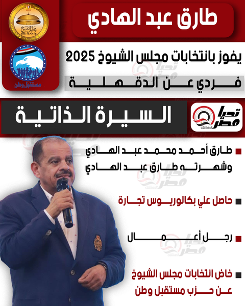 تحيا مصر ينشر السيرة الذاتية للنائب طارق عبد الهادي عضو مجلس الشيوخ 2025 بالنظام الفردي عن الدقهلية