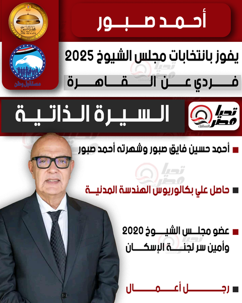 تحيا مصر ينشر السيرة الذاتية للنائب أحمد صبور عضو مجلس الشيوخ 2025 بالنظام الفردي عن القاهرة