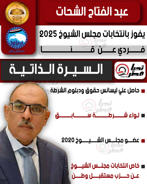 تحيا مصر ينشر السيرة الذاتية للنائب عبد الفتاح الشحات عضو مجلس الشيوخ 2025 بالنظام الفردي عن قنا