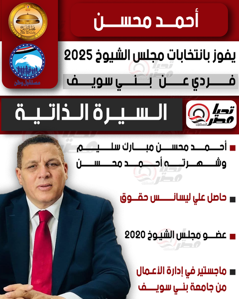 تحيا مصر ينشر السيرة الذاتية للنائب أحمد محسن عضو مجلس الشيوخ 2025 بالنظام الفردي عن بني سيوف