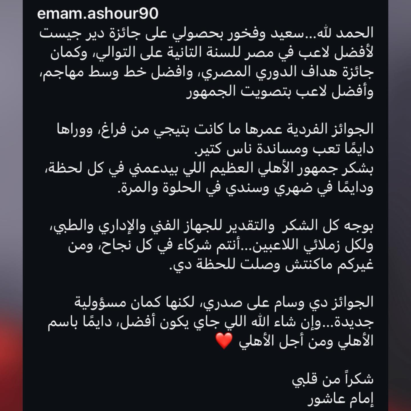 واختتم رسالته قائلًا:"الجوائز دي وسام على صدري، لكنها كمان مسؤولية جديدة... وإن شاء الله اللي جاي يكون أفضل، دايمًا باسم الأهلي ومن أجل الأهلي، شكراً من قلبي، إمام عاشور".